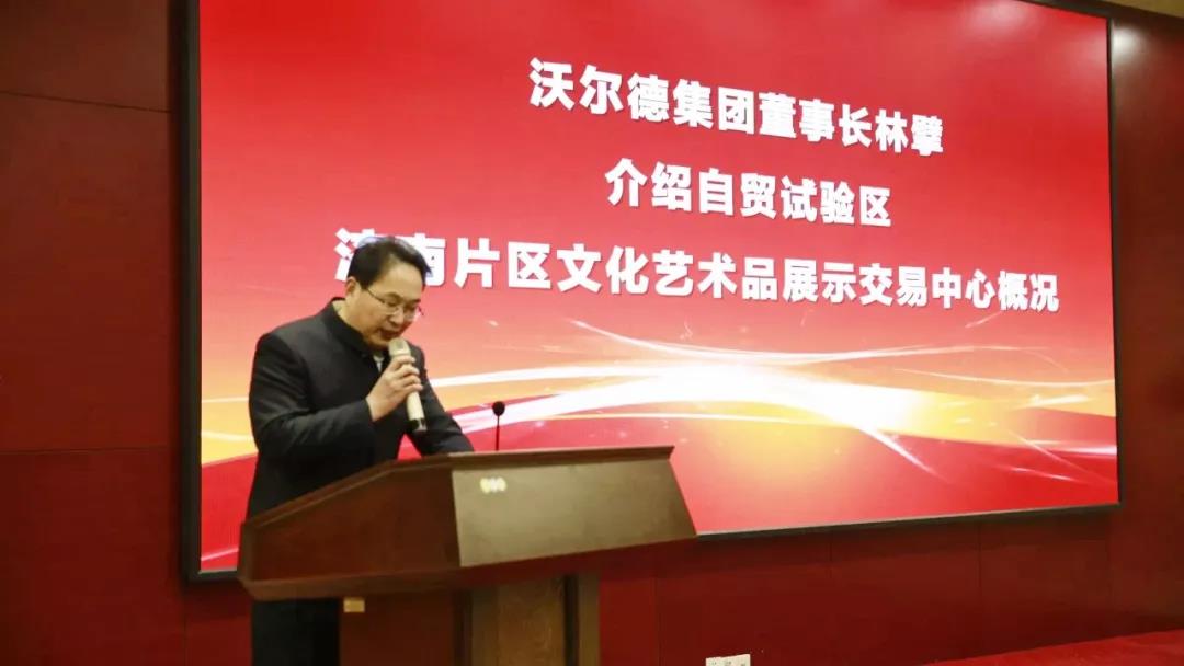 掛牌活動(dòng)現(xiàn)場,沃爾德集團(tuán)董事長林擘介紹了“自貿(mào)試驗(yàn)區(qū)濟(jì)南片區(qū)文化藝術(shù)品展示交易中心”概況。